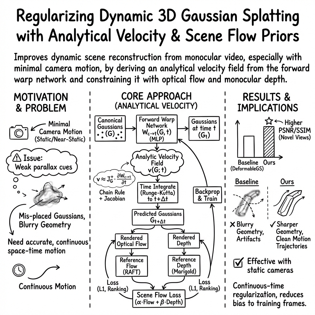 Abstract: Gaussian Splatting and its dynamic extensions are effective for reconstructing 3D scenes from 2D images when there is significant camera movement to facilitate motion parallax and when scene objects remain relatively static. However, in many real-world scenarios, these conditions are not met. As a consequence, data-driven semantic and geometric priors have been favored as regularizers, despite their bias toward training data and their neglect of broader movement dynamics. Departing from this practice, we propose a novel analytical approach that adapts the classical Lucas-Kanade method to dynamic Gaussian splatting. By leveraging the intrinsic properties of the forward warp field network, we derive an analytical velocity field that, through time integration, facilitates accurate scene flow computation. This enables the precise enforcement of motion constraints on warp fields, thus constraining both 2D motion and 3D positions of the Gaussians. Our method excels in reconstructing highly dynamic scenes with minimal camera movement, as demonstrated through experiments on both synthetic and real-world scenes.